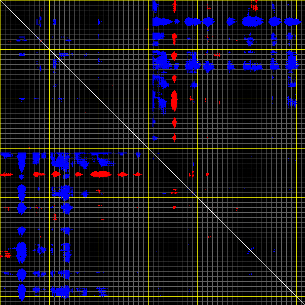 This matrix displays the maximum distance fluctuations between all pairs of CA atoms and between the two extreme conformations that were computed for this mode (DQMIN/DQMAX). Distance increases are plotted in blue and decreases in red for the strongest 10% of the residue pair distance changes. Every pixel corresponds to a single residue. Grey lines are drawn every 10 residues, yellow lines every 100 residues (counting from the upper left corner).