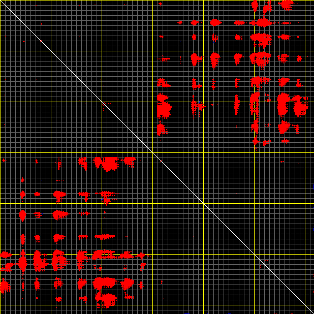 This matrix displays the maximum distance fluctuations between all pairs of CA atoms and between the two extreme conformations that were computed for this mode (DQMIN/DQMAX). Distance increases are plotted in blue and decreases in red for the strongest 10% of the residue pair distance changes. Every pixel corresponds to a single residue. Grey lines are drawn every 10 residues, yellow lines every 100 residues (counting from the upper left corner).