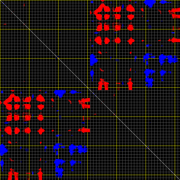 This matrix displays the maximum distance fluctuations between all pairs of CA atoms and between the two extreme conformations that were computed for this mode (DQMIN/DQMAX). Distance increases are plotted in blue and decreases in red for the strongest 10% of the residue pair distance changes. Every pixel corresponds to a single residue. Grey lines are drawn every 10 residues, yellow lines every 100 residues (counting from the upper left corner).