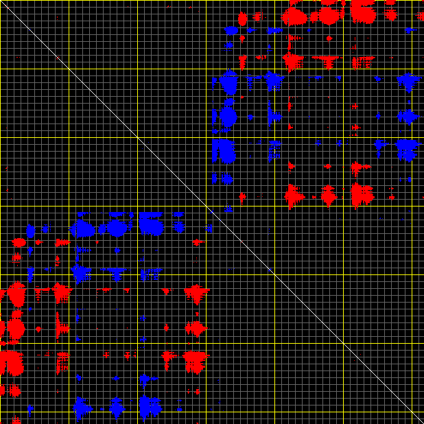 This matrix displays the maximum distance fluctuations between all pairs of CA atoms and between the two extreme conformations that were computed for this mode (DQMIN/DQMAX). Distance increases are plotted in blue and decreases in red for the strongest 10% of the residue pair distance changes. Every pixel corresponds to a single residue. Grey lines are drawn every 10 residues, yellow lines every 100 residues (counting from the upper left corner).