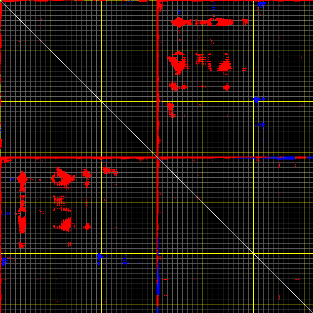This matrix displays the maximum distance fluctuations between all pairs of CA atoms and between the two extreme conformations that were computed for this mode (DQMIN/DQMAX). Distance increases are plotted in blue and decreases in red for the strongest 10% of the residue pair distance changes. Every pixel corresponds to a single residue. Grey lines are drawn every 10 residues, yellow lines every 100 residues (counting from the upper left corner).