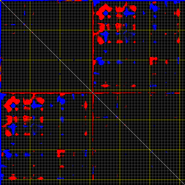 This matrix displays the maximum distance fluctuations between all pairs of CA atoms and between the two extreme conformations that were computed for this mode (DQMIN/DQMAX). Distance increases are plotted in blue and decreases in red for the strongest 10% of the residue pair distance changes. Every pixel corresponds to a single residue. Grey lines are drawn every 10 residues, yellow lines every 100 residues (counting from the upper left corner).