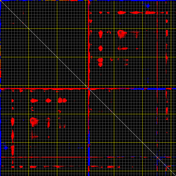 This matrix displays the maximum distance fluctuations between all pairs of CA atoms and between the two extreme conformations that were computed for this mode (DQMIN/DQMAX). Distance increases are plotted in blue and decreases in red for the strongest 10% of the residue pair distance changes. Every pixel corresponds to a single residue. Grey lines are drawn every 10 residues, yellow lines every 100 residues (counting from the upper left corner).