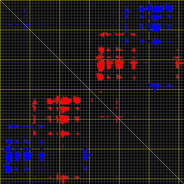 This matrix displays the maximum distance fluctuations between all pairs of CA atoms and between the two extreme conformations that were computed for this mode (DQMIN/DQMAX). Distance increases are plotted in blue and decreases in red for the strongest 10% of the residue pair distance changes. Every pixel corresponds to a single residue. Grey lines are drawn every 10 residues, yellow lines every 100 residues (counting from the upper left corner).