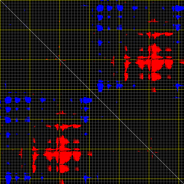 This matrix displays the maximum distance fluctuations between all pairs of CA atoms and between the two extreme conformations that were computed for this mode (DQMIN/DQMAX). Distance increases are plotted in blue and decreases in red for the strongest 10% of the residue pair distance changes. Every pixel corresponds to a single residue. Grey lines are drawn every 10 residues, yellow lines every 100 residues (counting from the upper left corner).