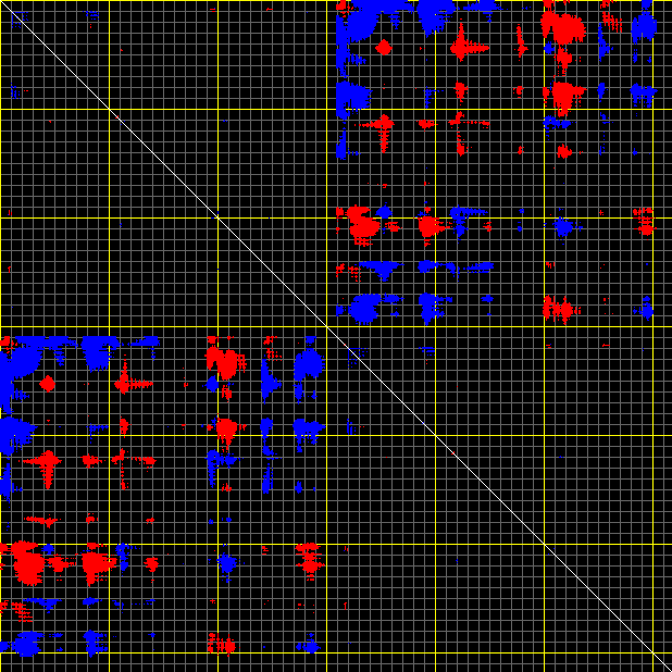 This matrix displays the maximum distance fluctuations between all pairs of CA atoms and between the two extreme conformations that were computed for this mode (DQMIN/DQMAX). Distance increases are plotted in blue and decreases in red for the strongest 10% of the residue pair distance changes. Every pixel corresponds to a single residue. Grey lines are drawn every 10 residues, yellow lines every 100 residues (counting from the upper left corner).