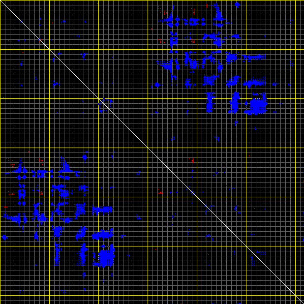 This matrix displays the maximum distance fluctuations between all pairs of CA atoms and between the two extreme conformations that were computed for this mode (DQMIN/DQMAX). Distance increases are plotted in blue and decreases in red for the strongest 10% of the residue pair distance changes. Every pixel corresponds to a single residue. Grey lines are drawn every 10 residues, yellow lines every 100 residues (counting from the upper left corner).