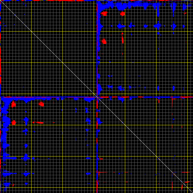 This matrix displays the maximum distance fluctuations between all pairs of CA atoms and between the two extreme conformations that were computed for this mode (DQMIN/DQMAX). Distance increases are plotted in blue and decreases in red for the strongest 10% of the residue pair distance changes. Every pixel corresponds to a single residue. Grey lines are drawn every 10 residues, yellow lines every 100 residues (counting from the upper left corner).
