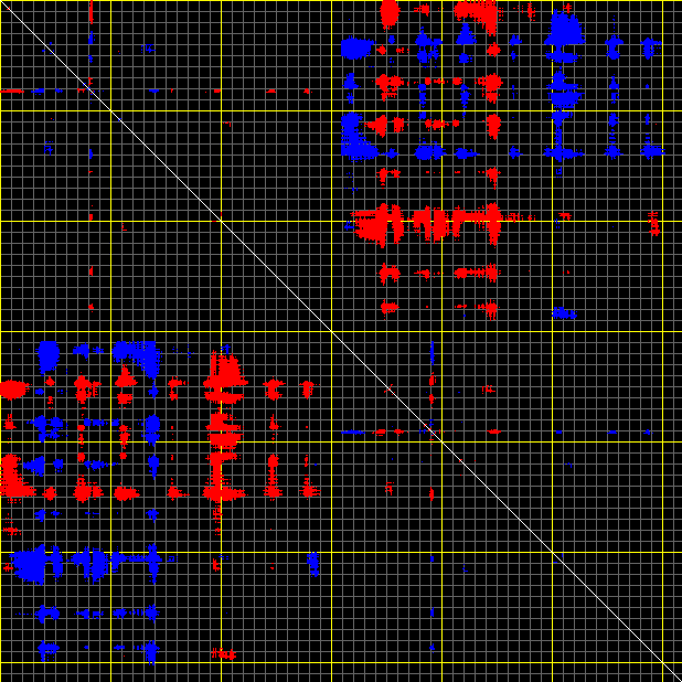 This matrix displays the maximum distance fluctuations between all pairs of CA atoms and between the two extreme conformations that were computed for this mode (DQMIN/DQMAX). Distance increases are plotted in blue and decreases in red for the strongest 10% of the residue pair distance changes. Every pixel corresponds to a single residue. Grey lines are drawn every 10 residues, yellow lines every 100 residues (counting from the upper left corner).