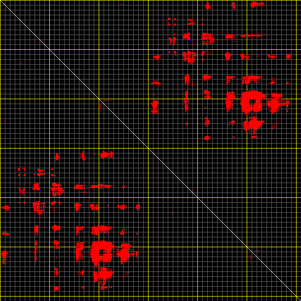 This matrix displays the maximum distance fluctuations between all pairs of CA atoms and between the two extreme conformations that were computed for this mode (DQMIN/DQMAX). Distance increases are plotted in blue and decreases in red for the strongest 10% of the residue pair distance changes. Every pixel corresponds to a single residue. Grey lines are drawn every 10 residues, yellow lines every 100 residues (counting from the upper left corner).
