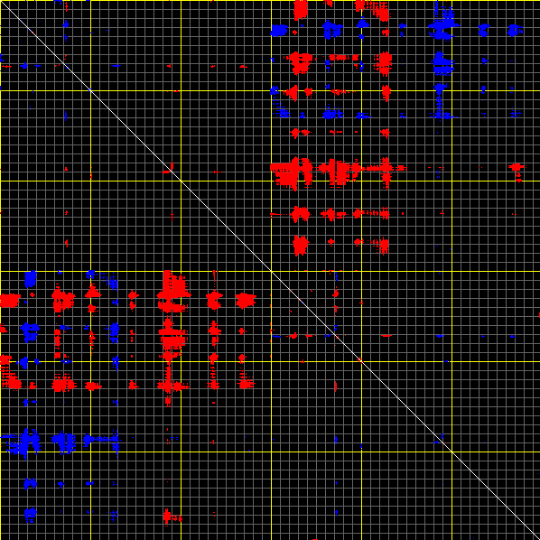 This matrix displays the maximum distance fluctuations between all pairs of CA atoms and between the two extreme conformations that were computed for this mode (DQMIN/DQMAX). Distance increases are plotted in blue and decreases in red for the strongest 10% of the residue pair distance changes. Every pixel corresponds to a single residue. Grey lines are drawn every 10 residues, yellow lines every 100 residues (counting from the upper left corner).