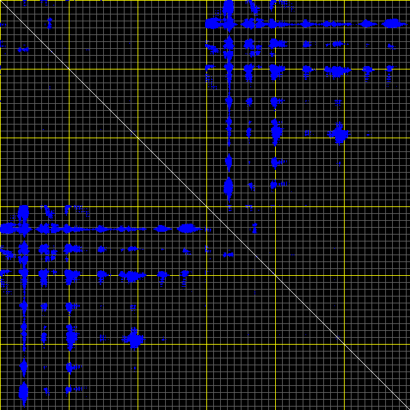 This matrix displays the maximum distance fluctuations between all pairs of CA atoms and between the two extreme conformations that were computed for this mode (DQMIN/DQMAX). Distance increases are plotted in blue and decreases in red for the strongest 10% of the residue pair distance changes. Every pixel corresponds to a single residue. Grey lines are drawn every 10 residues, yellow lines every 100 residues (counting from the upper left corner).