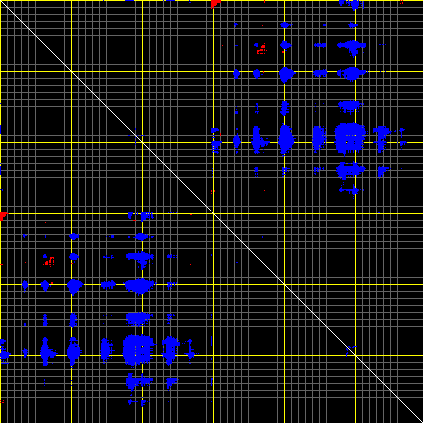 This matrix displays the maximum distance fluctuations between all pairs of CA atoms and between the two extreme conformations that were computed for this mode (DQMIN/DQMAX). Distance increases are plotted in blue and decreases in red for the strongest 10% of the residue pair distance changes. Every pixel corresponds to a single residue. Grey lines are drawn every 10 residues, yellow lines every 100 residues (counting from the upper left corner).