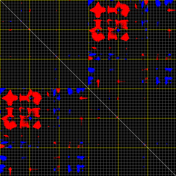 This matrix displays the maximum distance fluctuations between all pairs of CA atoms and between the two extreme conformations that were computed for this mode (DQMIN/DQMAX). Distance increases are plotted in blue and decreases in red for the strongest 10% of the residue pair distance changes. Every pixel corresponds to a single residue. Grey lines are drawn every 10 residues, yellow lines every 100 residues (counting from the upper left corner).