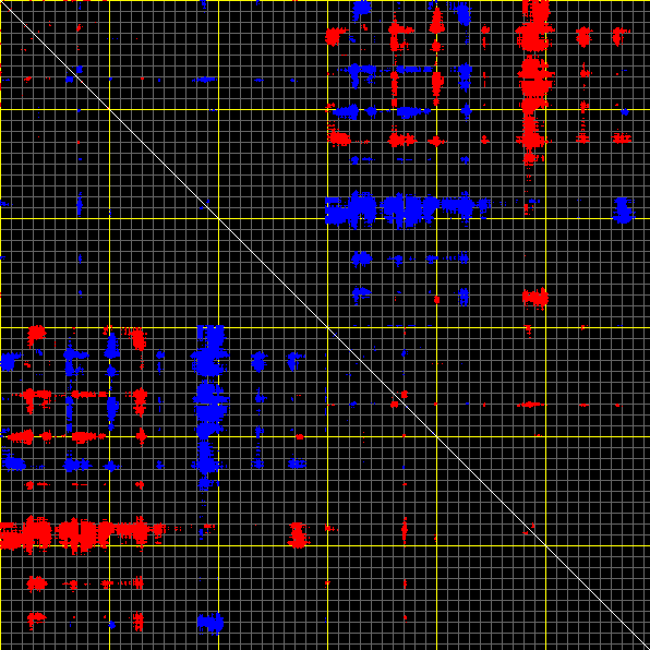 This matrix displays the maximum distance fluctuations between all pairs of CA atoms and between the two extreme conformations that were computed for this mode (DQMIN/DQMAX). Distance increases are plotted in blue and decreases in red for the strongest 10% of the residue pair distance changes. Every pixel corresponds to a single residue. Grey lines are drawn every 10 residues, yellow lines every 100 residues (counting from the upper left corner).