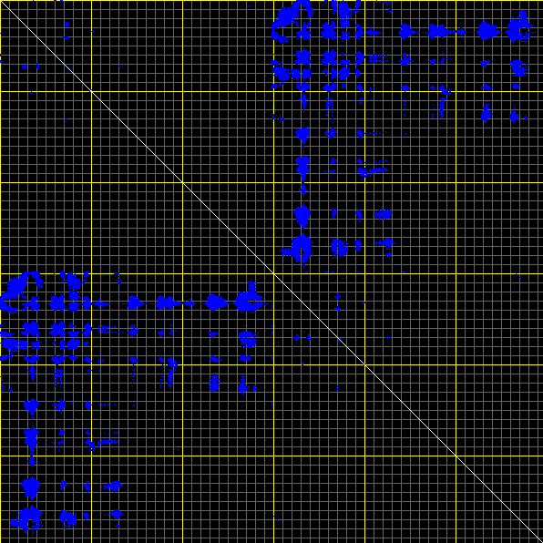 This matrix displays the maximum distance fluctuations between all pairs of CA atoms and between the two extreme conformations that were computed for this mode (DQMIN/DQMAX). Distance increases are plotted in blue and decreases in red for the strongest 10% of the residue pair distance changes. Every pixel corresponds to a single residue. Grey lines are drawn every 10 residues, yellow lines every 100 residues (counting from the upper left corner).