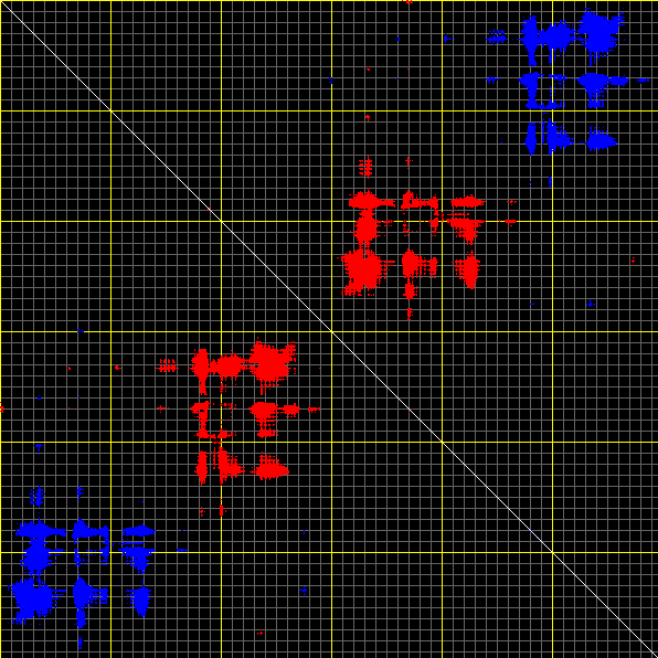 This matrix displays the maximum distance fluctuations between all pairs of CA atoms and between the two extreme conformations that were computed for this mode (DQMIN/DQMAX). Distance increases are plotted in blue and decreases in red for the strongest 10% of the residue pair distance changes. Every pixel corresponds to a single residue. Grey lines are drawn every 10 residues, yellow lines every 100 residues (counting from the upper left corner).