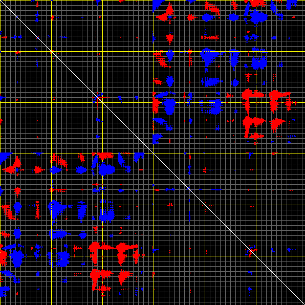 This matrix displays the maximum distance fluctuations between all pairs of CA atoms and between the two extreme conformations that were computed for this mode (DQMIN/DQMAX). Distance increases are plotted in blue and decreases in red for the strongest 10% of the residue pair distance changes. Every pixel corresponds to a single residue. Grey lines are drawn every 10 residues, yellow lines every 100 residues (counting from the upper left corner).