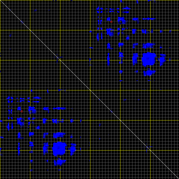 This matrix displays the maximum distance fluctuations between all pairs of CA atoms and between the two extreme conformations that were computed for this mode (DQMIN/DQMAX). Distance increases are plotted in blue and decreases in red for the strongest 10% of the residue pair distance changes. Every pixel corresponds to a single residue. Grey lines are drawn every 10 residues, yellow lines every 100 residues (counting from the upper left corner).