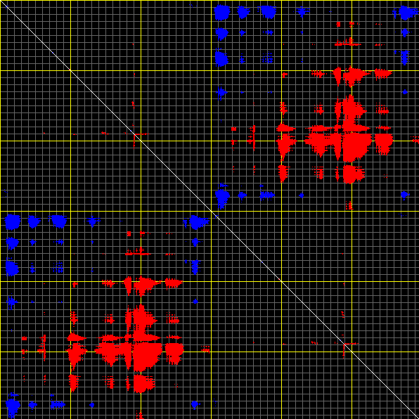 This matrix displays the maximum distance fluctuations between all pairs of CA atoms and between the two extreme conformations that were computed for this mode (DQMIN/DQMAX). Distance increases are plotted in blue and decreases in red for the strongest 10% of the residue pair distance changes. Every pixel corresponds to a single residue. Grey lines are drawn every 10 residues, yellow lines every 100 residues (counting from the upper left corner).