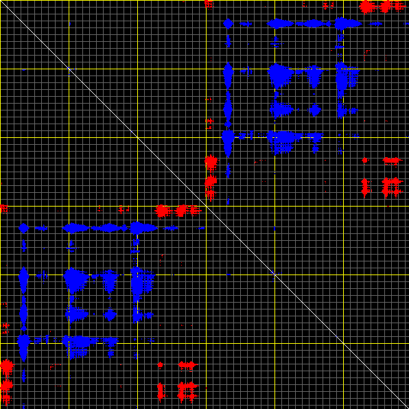 This matrix displays the maximum distance fluctuations between all pairs of CA atoms and between the two extreme conformations that were computed for this mode (DQMIN/DQMAX). Distance increases are plotted in blue and decreases in red for the strongest 10% of the residue pair distance changes. Every pixel corresponds to a single residue. Grey lines are drawn every 10 residues, yellow lines every 100 residues (counting from the upper left corner).