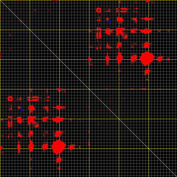 This matrix displays the maximum distance fluctuations between all pairs of CA atoms and between the two extreme conformations that were computed for this mode (DQMIN/DQMAX). Distance increases are plotted in blue and decreases in red for the strongest 10% of the residue pair distance changes. Every pixel corresponds to a single residue. Grey lines are drawn every 10 residues, yellow lines every 100 residues (counting from the upper left corner).