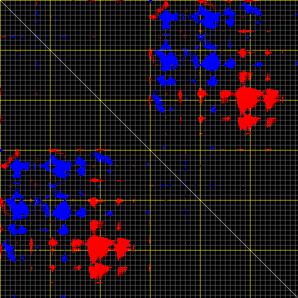This matrix displays the maximum distance fluctuations between all pairs of CA atoms and between the two extreme conformations that were computed for this mode (DQMIN/DQMAX). Distance increases are plotted in blue and decreases in red for the strongest 10% of the residue pair distance changes. Every pixel corresponds to a single residue. Grey lines are drawn every 10 residues, yellow lines every 100 residues (counting from the upper left corner).