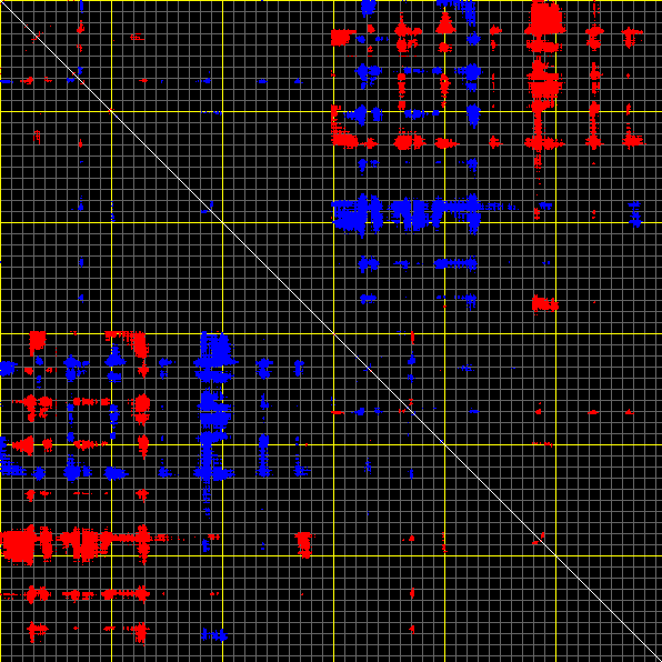 This matrix displays the maximum distance fluctuations between all pairs of CA atoms and between the two extreme conformations that were computed for this mode (DQMIN/DQMAX). Distance increases are plotted in blue and decreases in red for the strongest 10% of the residue pair distance changes. Every pixel corresponds to a single residue. Grey lines are drawn every 10 residues, yellow lines every 100 residues (counting from the upper left corner).