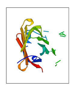 These views are prepared from three orthologuous viewpoints with MolScript. Secondary structures are determined from the C-alpha atom positions of your protein (N-terminal blue, C-terminal red).