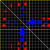 This matrix displays the maximum distance fluctuations between all pairs of CA atoms and between the two extreme conformations that were computed for this mode (DQMIN/DQMAX). Distance increases are plotted in blue and decreases in red for the strongest 10% of the residue pair distance changes. Every pixel corresponds to a single residue. Grey lines are drawn every 10 residues, yellow lines every 100 residues (counting from the upper left corner).