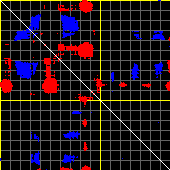 This matrix displays the maximum distance fluctuations between all pairs of CA atoms and between the two extreme conformations that were computed for this mode (DQMIN/DQMAX). Distance increases are plotted in blue and decreases in red for the strongest 10% of the residue pair distance changes. Every pixel corresponds to a single residue. Grey lines are drawn every 10 residues, yellow lines every 100 residues (counting from the upper left corner).