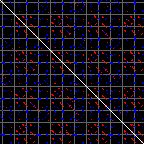 This matrix displays the maximum distance fluctuations between all pairs of CA atoms and between the two extreme conformations that were computed for this mode (DQMIN/DQMAX). Distance increases are plotted in blue and decreases in red for the strongest 10% of the residue pair distance changes. Every pixel corresponds to a single residue. Grey lines are drawn every 10 residues, yellow lines every 100 residues (counting from the upper left corner).