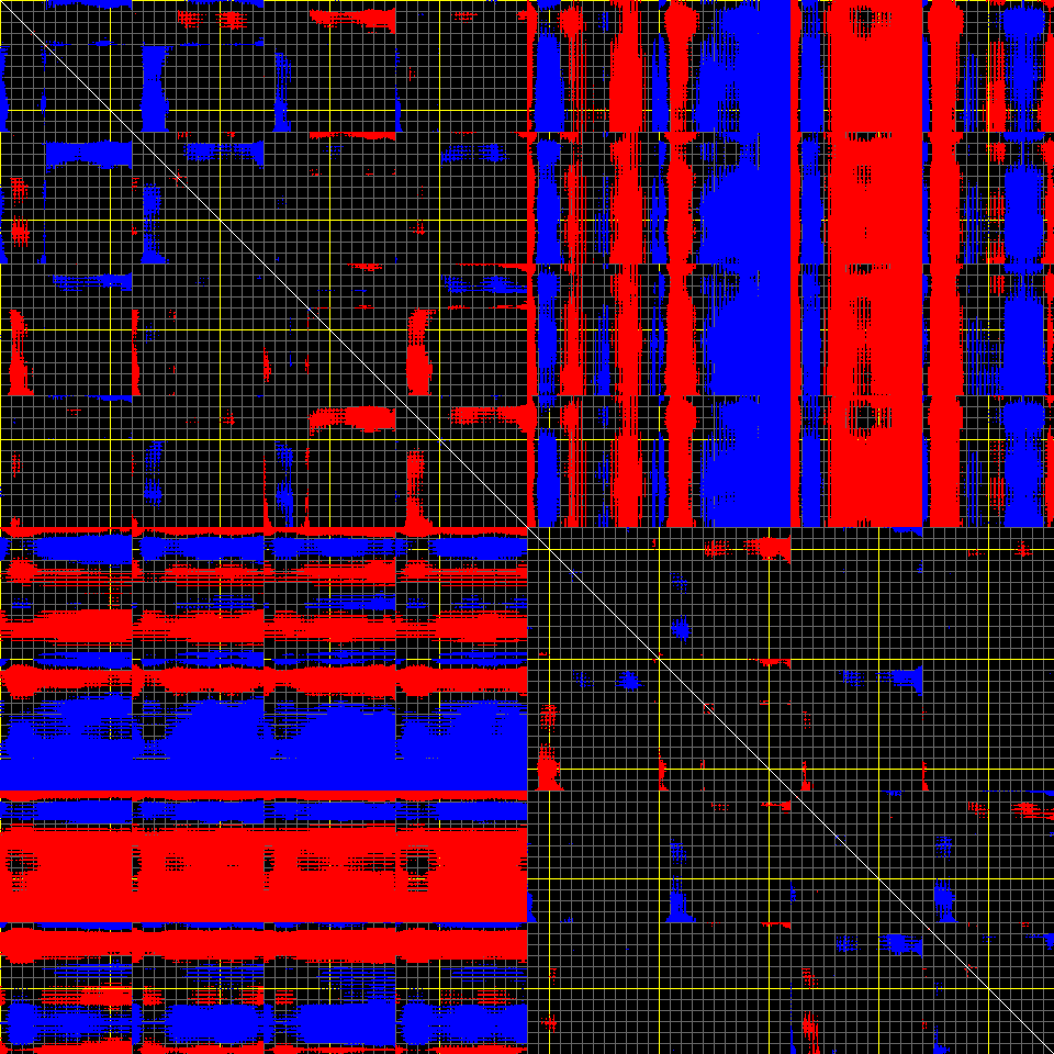 This matrix displays the maximum distance fluctuations between all pairs of CA atoms and between the two extreme conformations that were computed for this mode (DQMIN/DQMAX). Distance increases are plotted in blue and decreases in red for the strongest 10% of the residue pair distance changes. Every pixel corresponds to a single residue. Grey lines are drawn every 10 residues, yellow lines every 100 residues (counting from the upper left corner).