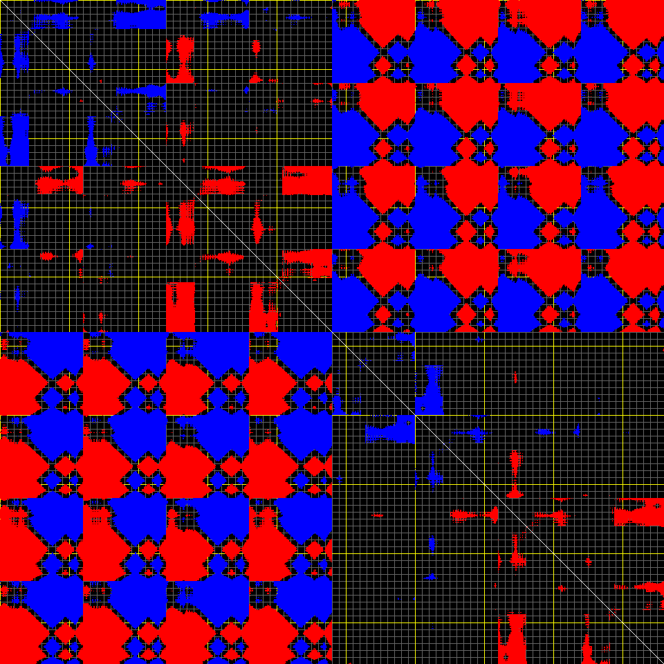 This matrix displays the maximum distance fluctuations between all pairs of CA atoms and between the two extreme conformations that were computed for this mode (DQMIN/DQMAX). Distance increases are plotted in blue and decreases in red for the strongest 10% of the residue pair distance changes. Every pixel corresponds to a single residue. Grey lines are drawn every 10 residues, yellow lines every 100 residues (counting from the upper left corner).
