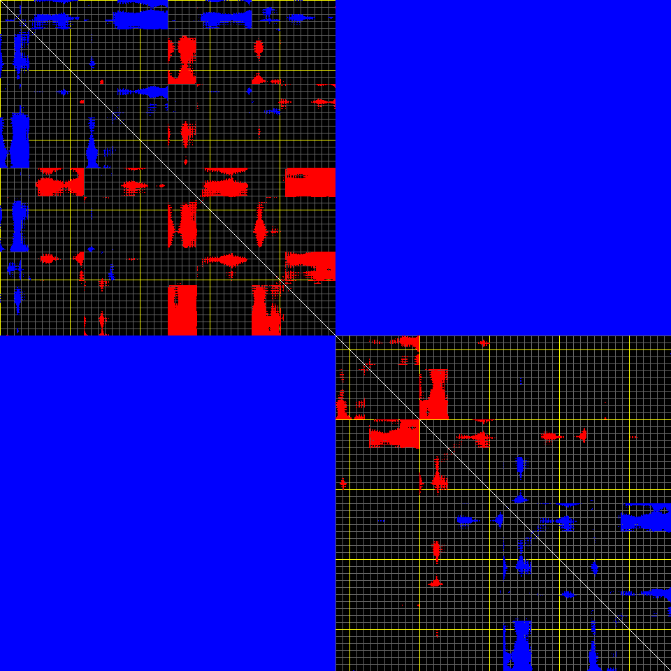 This matrix displays the maximum distance fluctuations between all pairs of CA atoms and between the two extreme conformations that were computed for this mode (DQMIN/DQMAX). Distance increases are plotted in blue and decreases in red for the strongest 10% of the residue pair distance changes. Every pixel corresponds to a single residue. Grey lines are drawn every 10 residues, yellow lines every 100 residues (counting from the upper left corner).
