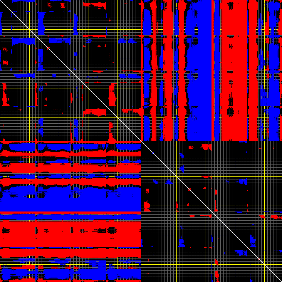 This matrix displays the maximum distance fluctuations between all pairs of CA atoms and between the two extreme conformations that were computed for this mode (DQMIN/DQMAX). Distance increases are plotted in blue and decreases in red for the strongest 10% of the residue pair distance changes. Every pixel corresponds to a single residue. Grey lines are drawn every 10 residues, yellow lines every 100 residues (counting from the upper left corner).