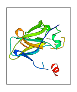 These views are prepared from three orthologuous viewpoints with MolScript. Secondary structures are determined from the C-alpha atom positions of your protein (N-terminal blue, C-terminal red).