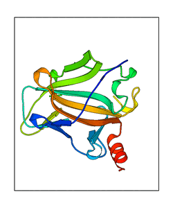 These views are prepared from three orthologuous viewpoints with MolScript. Secondary structures are determined from the C-alpha atom positions of your protein (N-terminal blue, C-terminal red).