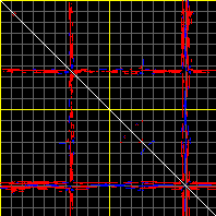 This matrix displays the maximum distance fluctuations between all pairs of CA atoms and between the two extreme conformations that were computed for this mode (DQMIN/DQMAX). Distance increases are plotted in blue and decreases in red for the strongest 10% of the residue pair distance changes. Every pixel corresponds to a single residue. Grey lines are drawn every 10 residues, yellow lines every 100 residues (counting from the upper left corner).