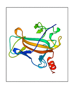 These views are prepared from three orthologuous viewpoints with MolScript. Secondary structures are determined from the C-alpha atom positions of your protein (N-terminal blue, C-terminal red).