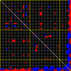 This matrix displays the maximum distance fluctuations between all pairs of CA atoms and between the two extreme conformations that were computed for this mode (DQMIN/DQMAX). Distance increases are plotted in blue and decreases in red for the strongest 10% of the residue pair distance changes. Every pixel corresponds to a single residue. Grey lines are drawn every 10 residues, yellow lines every 100 residues (counting from the upper left corner).