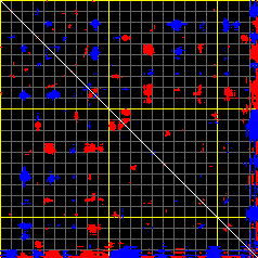 This matrix displays the maximum distance fluctuations between all pairs of CA atoms and between the two extreme conformations that were computed for this mode (DQMIN/DQMAX). Distance increases are plotted in blue and decreases in red for the strongest 10% of the residue pair distance changes. Every pixel corresponds to a single residue. Grey lines are drawn every 10 residues, yellow lines every 100 residues (counting from the upper left corner).