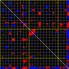This matrix displays the maximum distance fluctuations between all pairs of CA atoms and between the two extreme conformations that were computed for this mode (DQMIN/DQMAX). Distance increases are plotted in blue and decreases in red for the strongest 10% of the residue pair distance changes. Every pixel corresponds to a single residue. Grey lines are drawn every 10 residues, yellow lines every 100 residues (counting from the upper left corner).