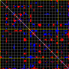This matrix displays the maximum distance fluctuations between all pairs of CA atoms and between the two extreme conformations that were computed for this mode (DQMIN/DQMAX). Distance increases are plotted in blue and decreases in red for the strongest 10% of the residue pair distance changes. Every pixel corresponds to a single residue. Grey lines are drawn every 10 residues, yellow lines every 100 residues (counting from the upper left corner).