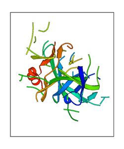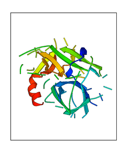 These views are prepared from three orthologuous viewpoints with MolScript. Secondary structures are determined from the C-alpha atom positions of your protein (N-terminal blue, C-terminal red).
