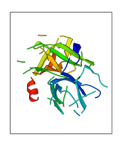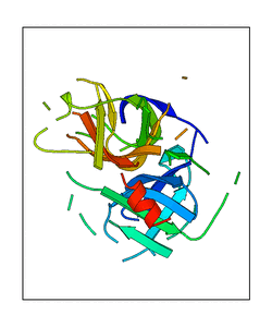 These views are prepared from three orthologuous viewpoints with MolScript. Secondary structures are determined from the C-alpha atom positions of your protein (N-terminal blue, C-terminal red).