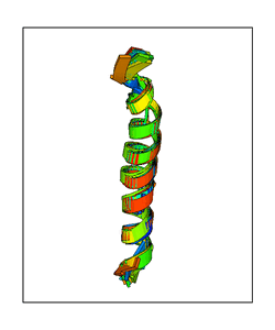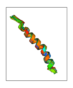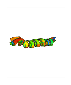 CAUTION: The amplitude range presented in these views corresponds to the highest (DQMAX) and lowest (DQMIN) perturbations chosen for this mode. Secondary structures can break down (and thus disappear from the animation) if the applied amplitudes are too large for Molscript to identify them. The choice of the amplitude is not a NMA result, but has to be done by the user on physical grounds. To change the amplitude range, you can recompute the animation of the desired mode by using the "Compute additional perturbed models with elNémo" section on the results page of your job.