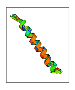CAUTION: The amplitude range presented in these views corresponds to the highest (DQMAX) and lowest (DQMIN) perturbations chosen for this mode. Secondary structures can break down (and thus disappear from the animation) if the applied amplitudes are too large for Molscript to identify them. The choice of the amplitude is not a NMA result, but has to be done by the user on physical grounds. To change the amplitude range, you can recompute the animation of the desired mode by using the "Compute additional perturbed models with elNémo" section on the results page of your job.