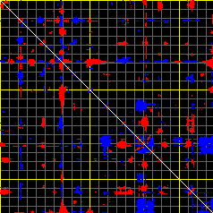 This matrix displays the maximum distance fluctuations between all pairs of CA atoms and between the two extreme conformations that were computed for this mode (DQMIN/DQMAX). Distance increases are plotted in blue and decreases in red for the strongest 10% of the residue pair distance changes. Every pixel corresponds to a single residue. Grey lines are drawn every 10 residues, yellow lines every 100 residues (counting from the upper left corner).