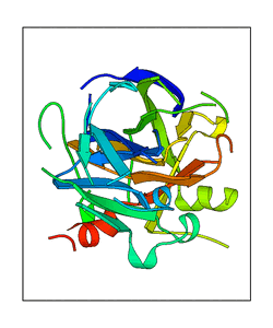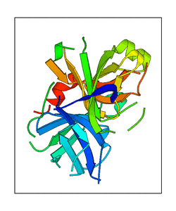 These views are prepared from three orthologuous viewpoints with MolScript. Secondary structures are determined from the C-alpha atom positions of your protein (N-terminal blue, C-terminal red).